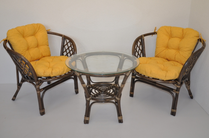 Ratanová sedací souprava Bahama se skládá ze dvou křesel, stolku se skleněnou deskou a kompletní sady polstrů.