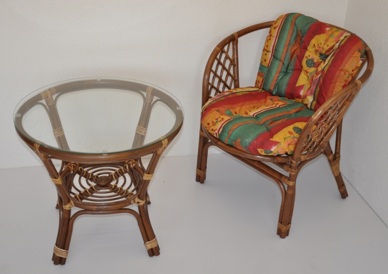 Ratanová sedací souprava je vyrobena z přírodního ratanu s barvou konstrukce odpovádající fotografii výrobku,obsahuje 1 křeslo a stolek se sklem.